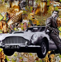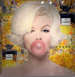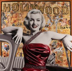 Sharing the same ground with twentieth century Pop Artists, DeVon merges painting with photography and other mixed media. He contextualizes new meaning from nostalgic icons by collaging the pages of modern magazines and books and then submerging the layers of images under a thick, glossy resin. The final layer of his work is often strewn with paint splatter and encrusted with diamond dust, glitter, and jewels. Just as his Pop Art predecessors elevated the so-called “low art” of comics and everyday consumer society into “high art”, DeVon’s work is thought of as a method of quotation, citation and commentary; an artistic “remix” that can be seen as a transformative work of creativity that forms part of the fabric of our wider cultural environment. He elevates iconic images into higher, even other-worldly realms where the figures become Gods and Goddesses and secular saints. He offers a witty view of modern society, filled with a strong sense of optimism. The finished pieces tell an emotional story, our favorite story, the story of the hero’s journey; which after all, is our own journey.