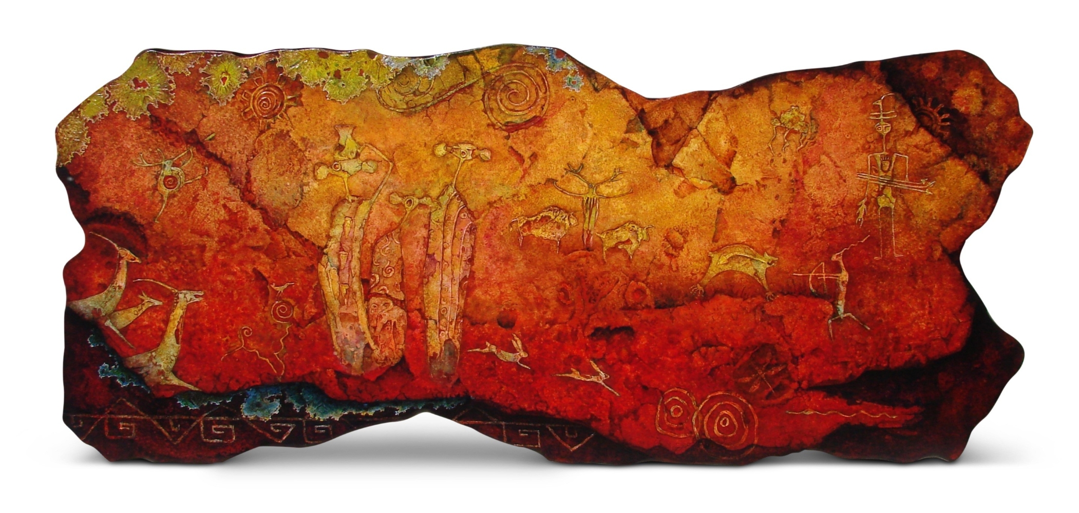 The etched images of rabbits are a powerful symbol of fertility. The herd of antelope and a pair of bison tells us of a happy time of abundance and prosperity. Concentric circles are a symbol of water while the double-ended spiral represents a journey in both the spiritual sense as well as the earthly.