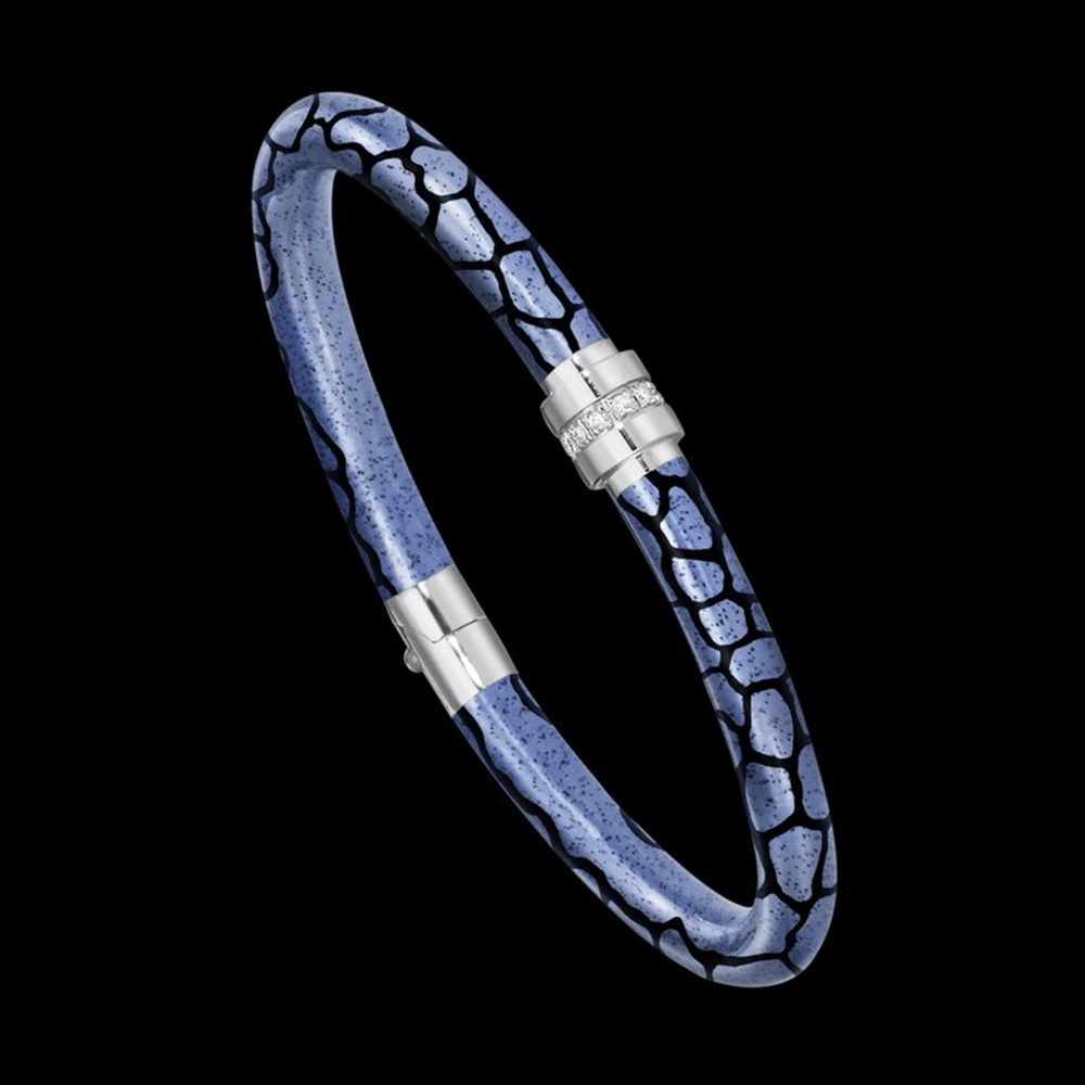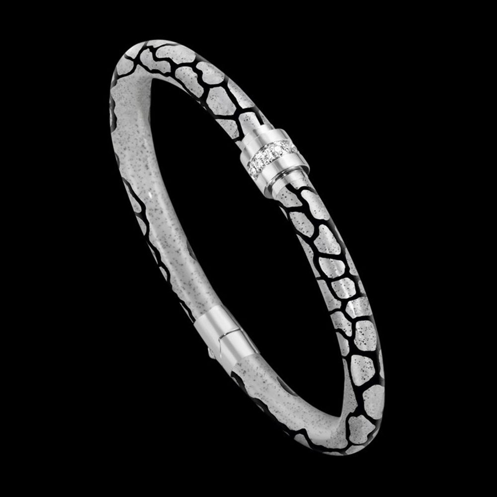 Please inquire with gallery for more information. | Sterling Silver and Italian enamel hinged bangle with gold pigment in crocodile pattern and .08 ct. tw. of diamonds.