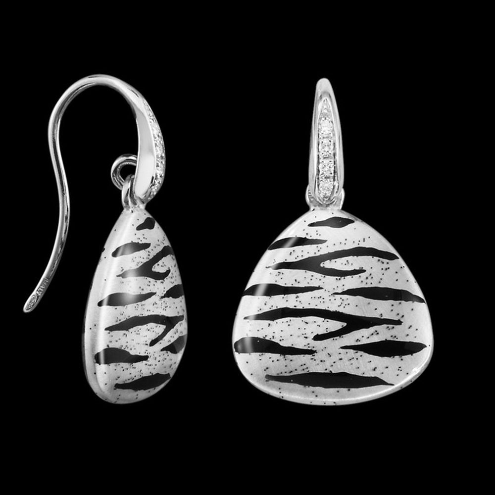Please inquire with gallery for more information. | Sterling Silver and Italian enamel triangle drop earrings in tiger stripe pattern and .12 ct. tw. of diamonds. Available in two color options: Gold and Silver.