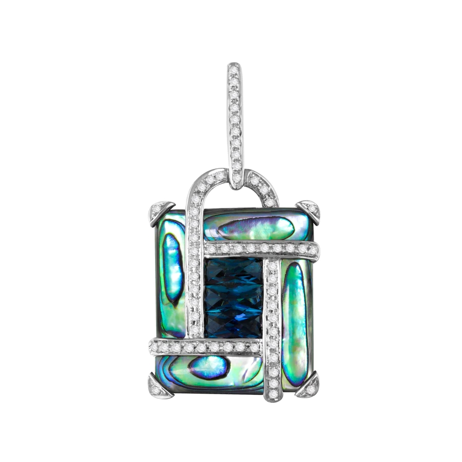 From the ‘ANASTASIA COLLECTION’ one custom designed enhancer. The enhancer is set in 14kt White gold and contains 0.31ct of genuine round Diamonds, 1.90ct of genuine London Blue Topaz and four inlays of genuine Abalone having a combined weight of 6.95ct.