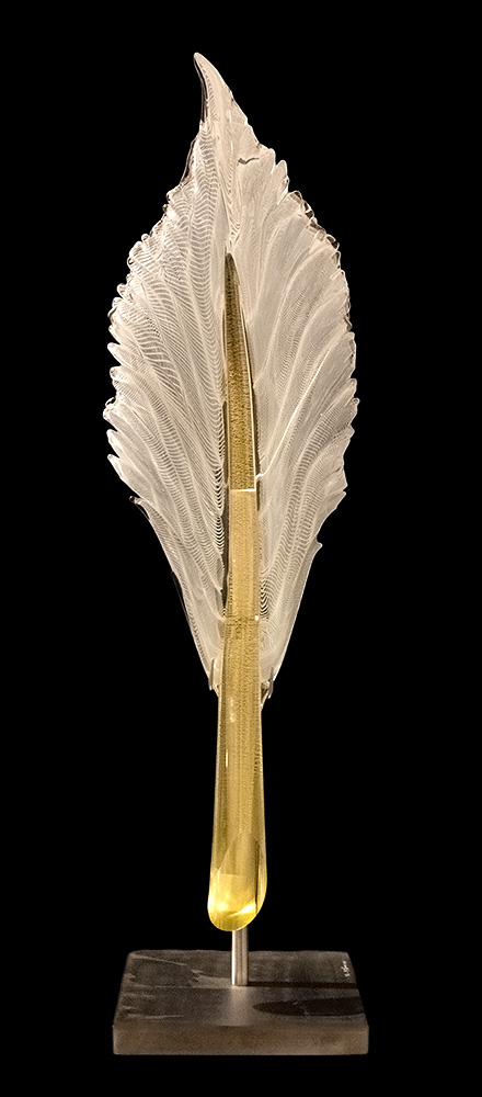 “The glass is alive when it is hot, it has a mind of its own and a memory. It has a mysteriousness about it that captures our curiosity. Hard like a rock, yet as transparent as the air we look through. The molten glass has exotic properties compared to other materials you come into contact with on a day to day basis. It glows with a brilliance of color and emits an enormous amount of heat that challenge me as a sculptor to find a way to control these extreme properties in order to achieve a finished piece of art. I make my sculptures to be meaningful objects to live with. Through experiences on this earth and what I have seen, what I have been shown by others and that which I have learned all influence my art. The sculptures you see are the ideas which I have attempted to bring forth from my imagination into this reality. Inspired by intriguing patterns found in nature and the amazing relationships shared by all living things I make art to share the beauty of life with others.” – Nic McGuire
