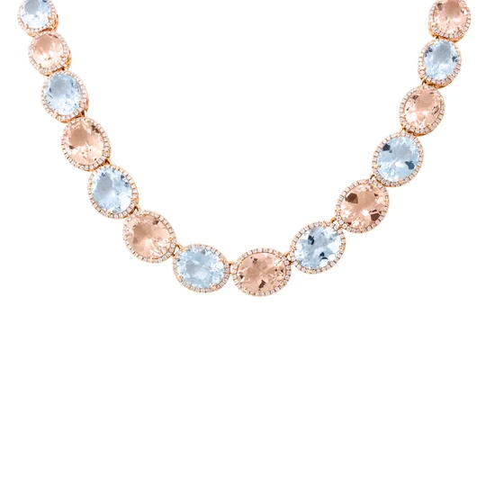 From the ‘AQUA & MORGANITE COLLECTION’ one custom designed Limited Edition necklace. The necklace is set in 14kt Rose gold and contains 1.93ct of genuine Diamonds and 73.68ct combination of genuine oval cut Morganite and Aquamarine.