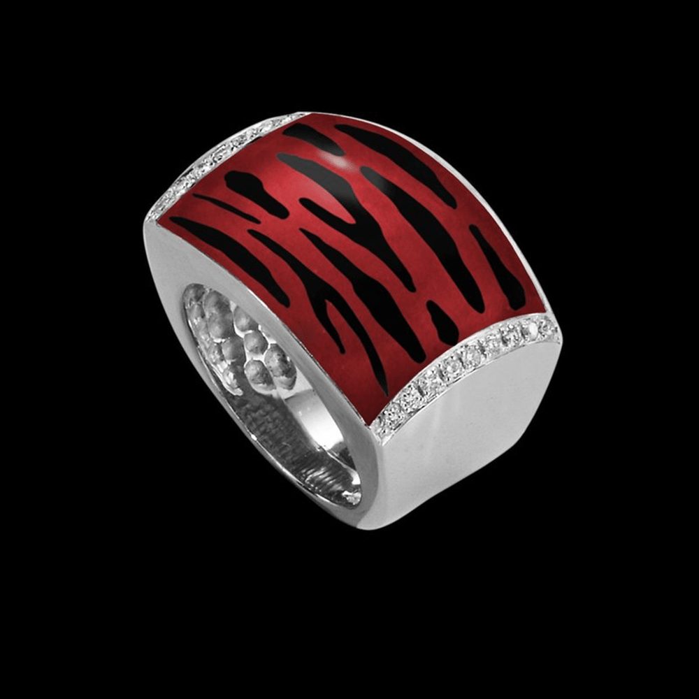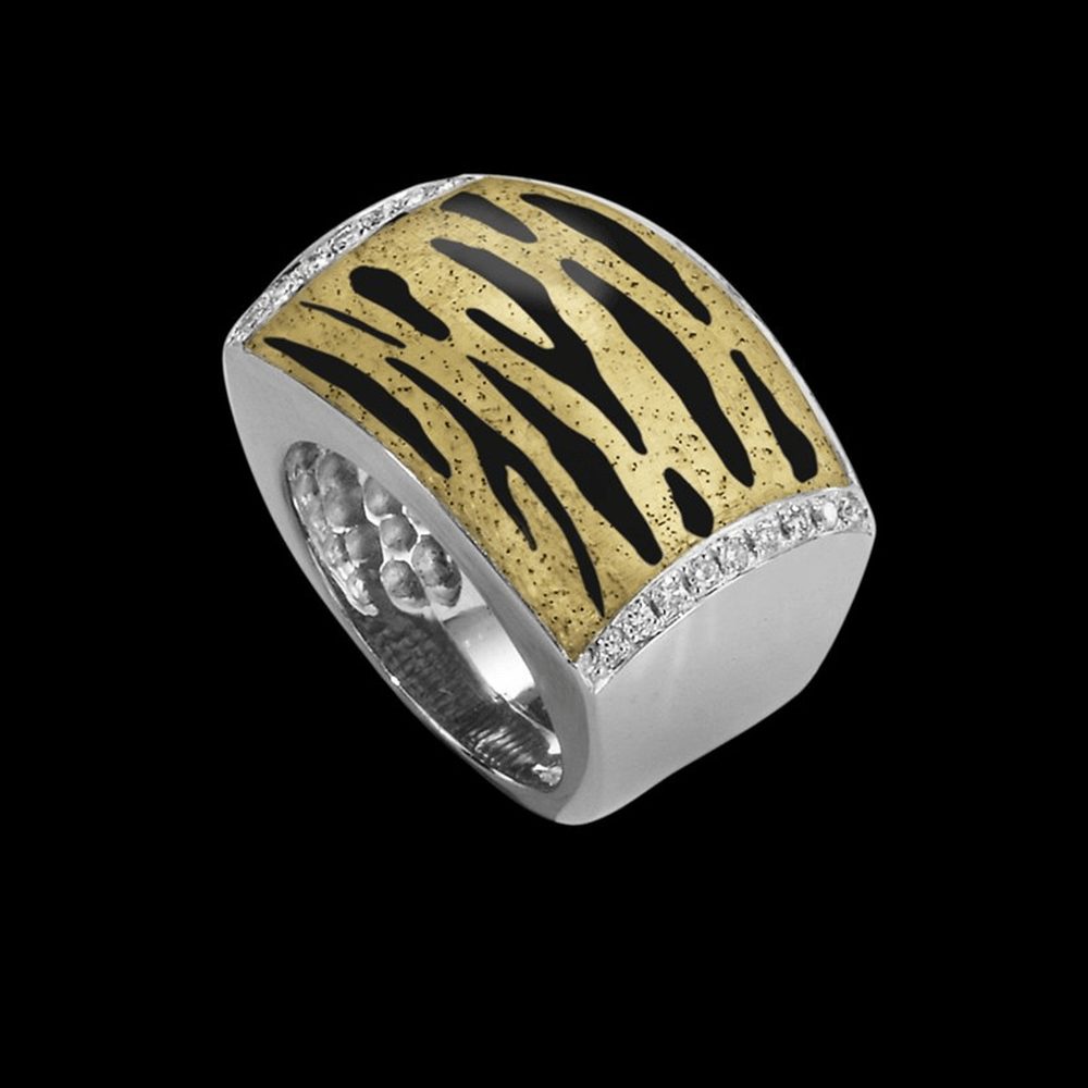 Please inquire with gallery for more information. | Sterling Silver and Italian enamel ring in tiger stripe pattern and .18 ct. tw. of diamonds. Available in 4 color options: Sapphire, Ruby, Gold, and Silver.