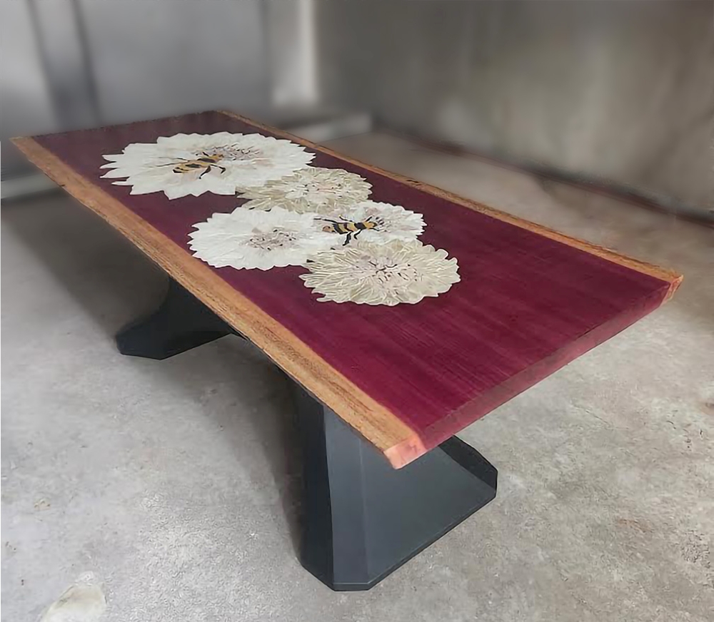 Honeybees doing what honeybees do, these amazing creatures get a little love here in recognition of the huge part they play in our world’s ecosystem. Inlaid into a beautiful live-edge slab of Brazilian Purpleheart wood, the larger-than-life bees’ bodies are made of Turkish gold travertine and honed black granite while the lightly scored wings are made of white tumbled marble, contrasted against a drift of super-sized white and gold onyx Dahlia flowers are accented by peach and mauve colored Italian marble centers. This full-sized coffee table is supported by a dynamic black metal base, and is sealed with multiple applications of a satin topcoat to ensure that the stunning purple wood will not fade and the stones are sealed in protection against food and drink spills.