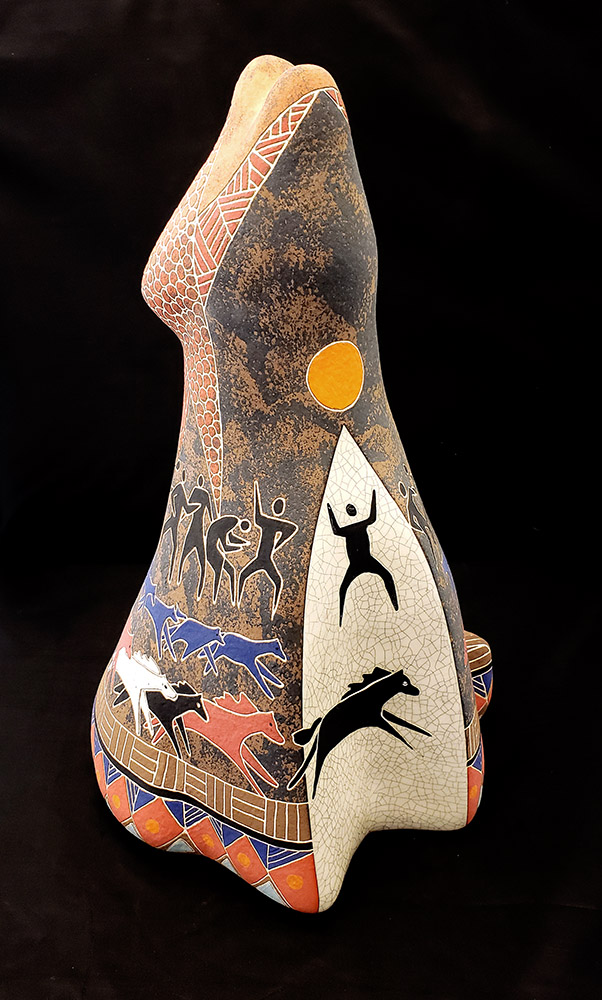 As artists, the collaboration of Gene and Rebecca Tobey was a breath of fresh air. The two created a style of art that is entirely unique and distinctive. Because of its ingenious simplification of sculptural imagery, and use of sgraffito, the Tobey design is instantly recognizable. Gene & Rebecca created their own symbolic language pulling from Native American imagery and their own experiences.