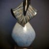 The pottery held by the “Born of Clay” sculpture has clouds and lightning lining prayer feathers to indicate our prayers for water. The large oval spaces represent water areas with dots acting as directions of the world. Our prayers are for water for all the world. Today, the First Mesa area of Hopi are known for their exceptional historical line of the finest potters.