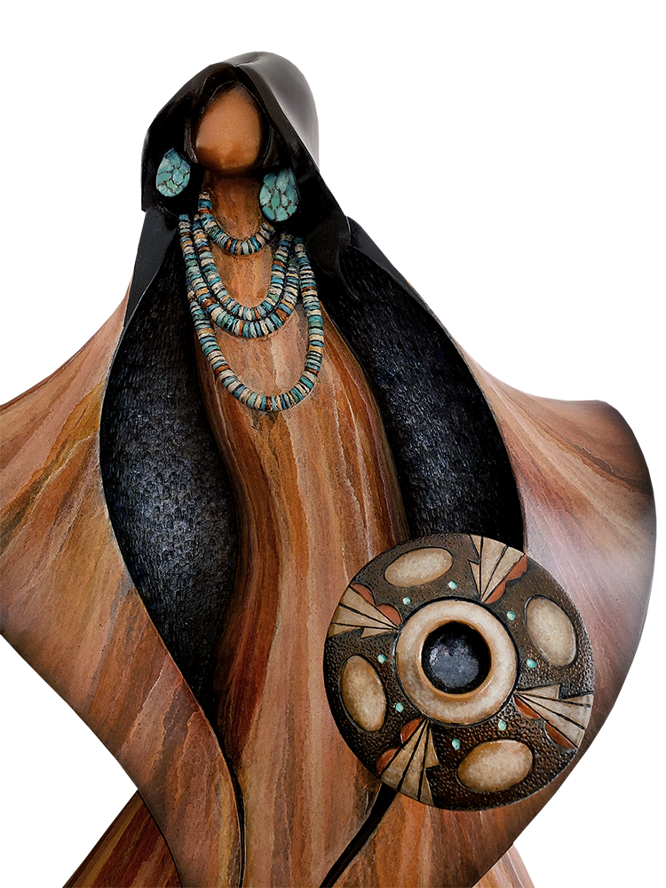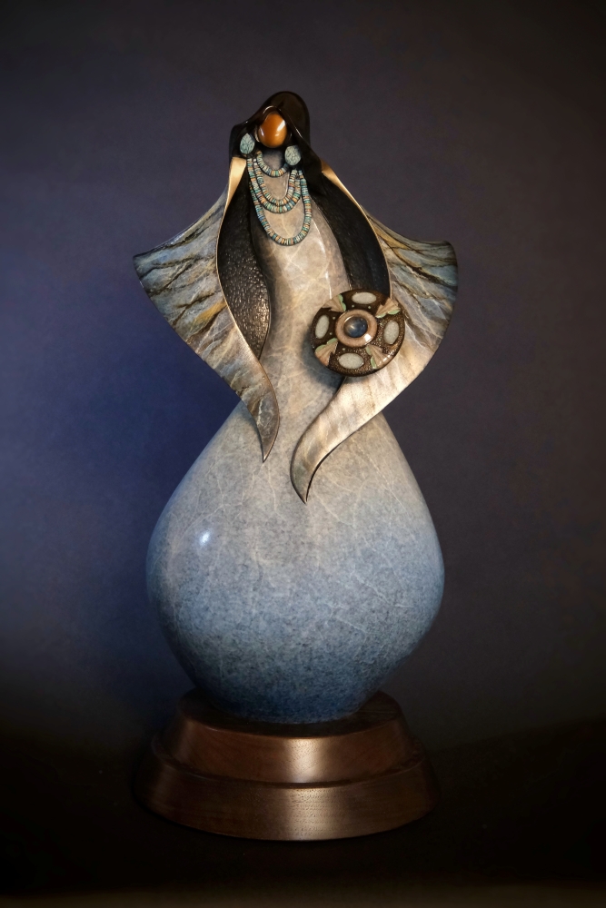The pottery held by the “Born of Clay” sculpture has clouds and lightning lining prayer feathers to indicate our prayers for water. The large oval spaces represent water areas with dots acting as directions of the world. Our prayers are for water for all the world. Today, the First Mesa area of Hopi are known for their exceptional historical line of the finest potters.