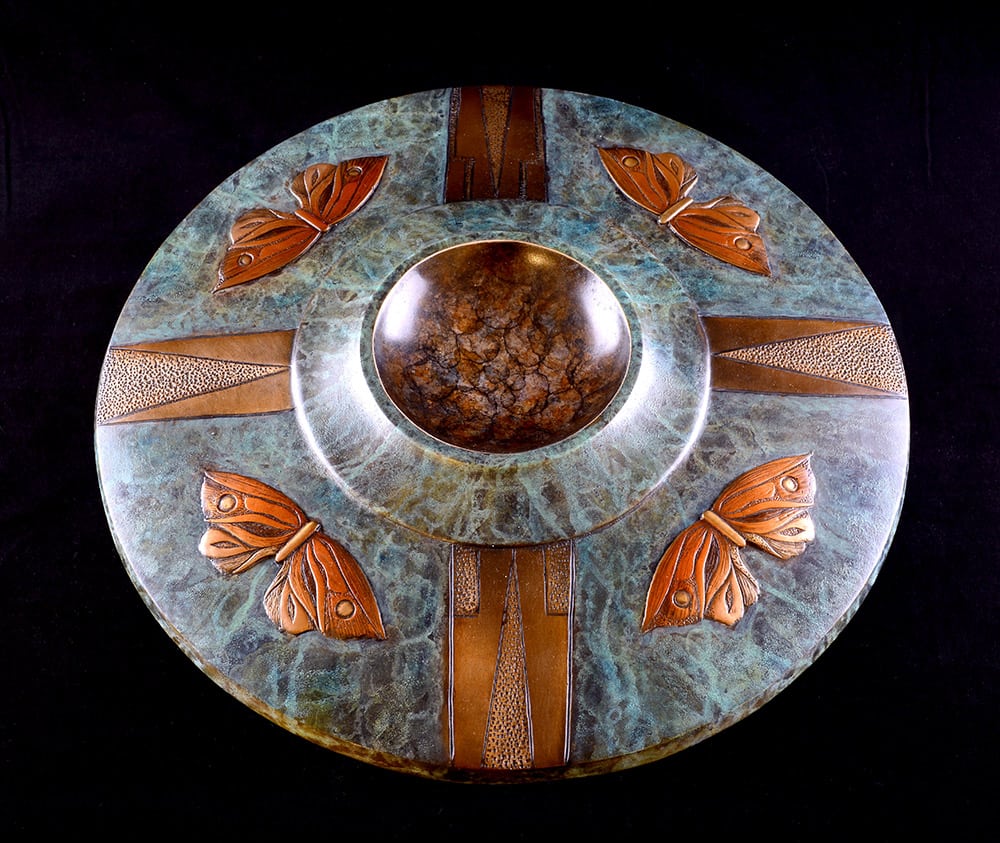 This butterfly design is an adapted example of a motif found at the Sikyatki ruins. Hopi pottery is made from a fine clay, enabling the potter to polish it with a smooth stone and apply mineral and vegetal paints directly onto the surface.This yellow ware is distinctly characteristic of today’s Hopi.