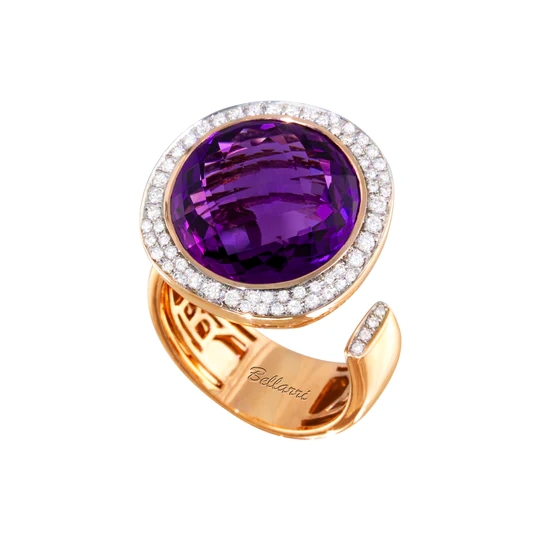 From the ‘CABARET COLLECTION’ one custom designed ring. The ring is set in 14kt Rose gold and contains 0.60ct of genuine Diamonds and 9.74ct center genuine Amethyst. Limited Edition.