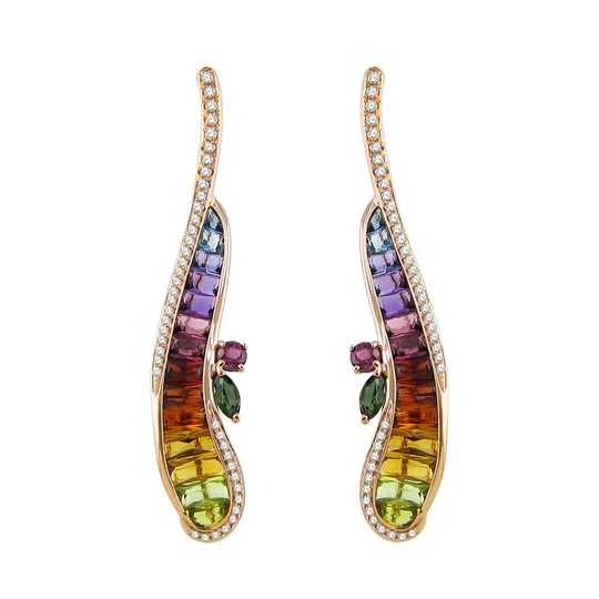 From the ‘CAPRI COLLECTION’ the earrings are set in 14kt Rose Gold and contain approximately 0.51ct of genuine Diamonds and 6.50ct combination of genuine multi color gemstones (Amethyst, Blue Topaz, Citrine, Green Tourmaline, Iolite, Peridot, and Rhodolite).
