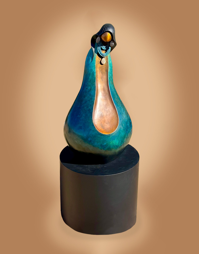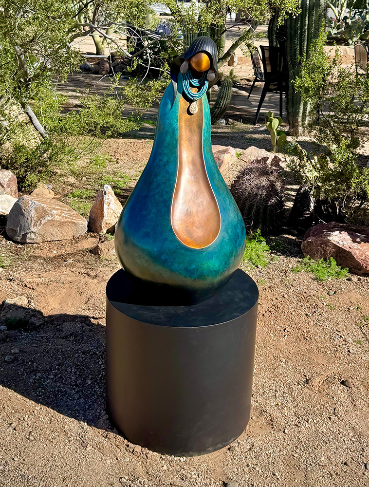 The flat plane that runs down the middle of her body represents the womb. In all aspects of Hopi the perpetuation of life is stressed. The Hopi people are a matriarchal society, where a child’s lineage comes from the mother. In traditional Hopi culture the women own the home, all of the household materials as well as the seeds planted every spring. A man will come to live with his wife’s family after marriage. Her hair is worn in a traditional style of being cut strait across her brow. This represents falling rain and reminds her of the prayers of all Hopi for rain. Her amulet represents clouds and lightening. The Patina represents a full cloud ready to burst with rain. This is the prayer of all Hopi people.