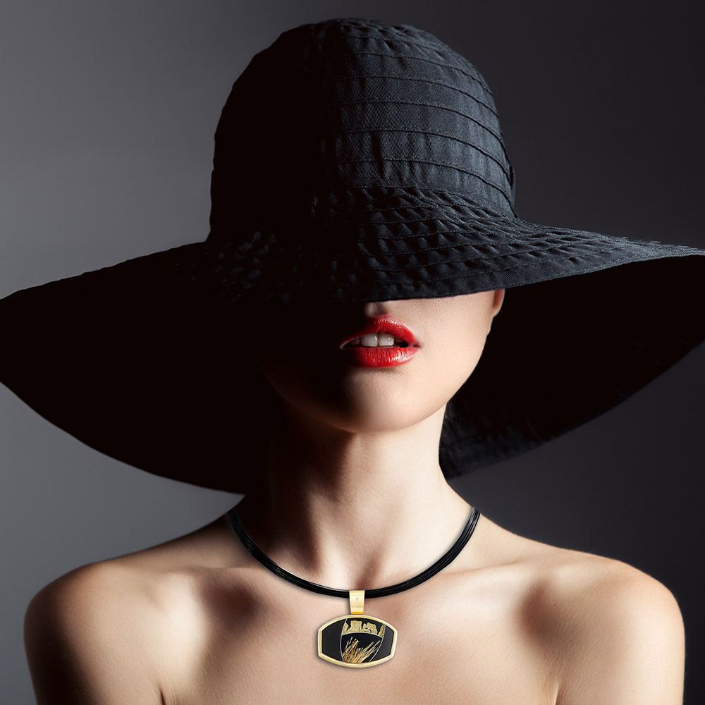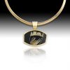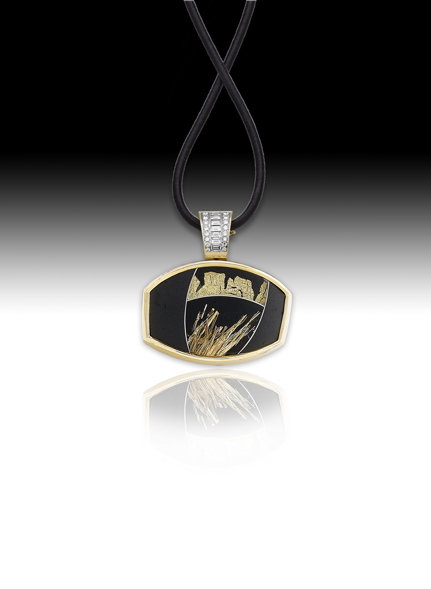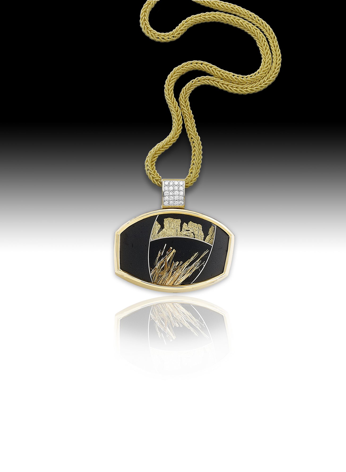 This one of a kind Jewel Drop showcases a stunning array of gemstones including Rutilated Quartz and Black Jade. These semi-precious gemstones are set in 18 Karat Yellow Gold. This Jewel Drop is featured in Barbara Westwood’s Paintings in Stones Collection Collection.