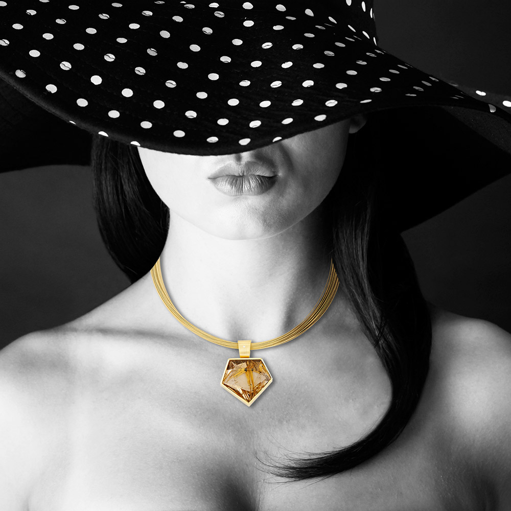 Chain and slide sold separately. Please inquire with your Art Consultant for available options. This One of a Kind Jewel Drop features 14.50 ct. tw. Rutile Quartz surrounded by 18 Karat Yellow Gold. Featured in Barbara Westwood’s Interchangeable Collection.