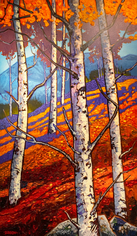 Massachusetts native, John Burrow’s acrylic and oil paintings are always bright, full of color and imbued with a sense of joy and playfulness. When people see his paintings for the first time, they frequently comment about how good his work makes them feel. He enjoys being able to express his warm memories of growing up in a small New England town using a folk art style. But when he wants to capture the beauty of an old farmhouse surrounded by a luxuriant garden, he chooses to use a more impressionistic “impasto” technique.
