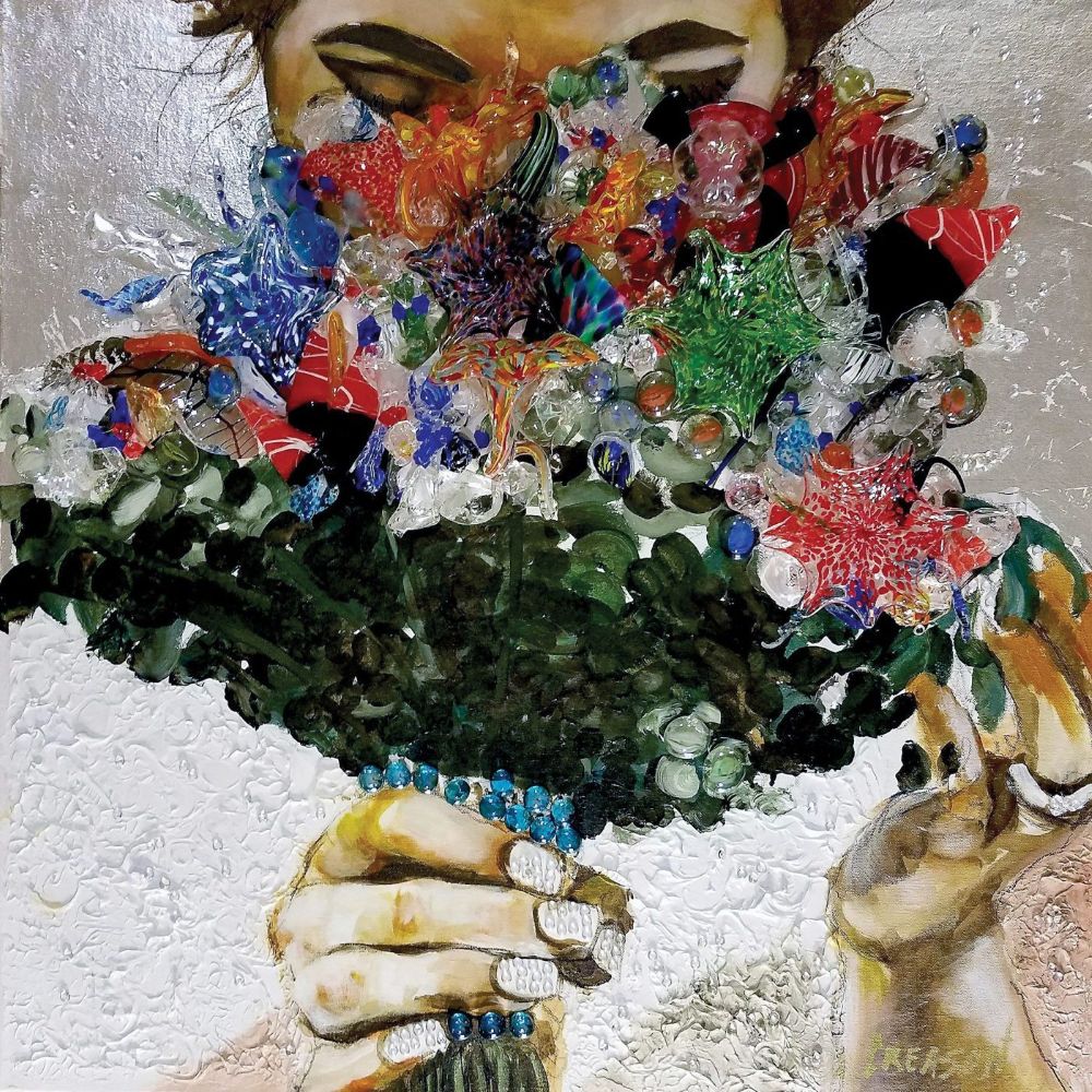 Creason’s works will invoke passion, boundless love, color and awe. His wife is his muse and main inspiration, always motivating him to create artwork that he might not have on his own. Creason chooses to depict women to spotlight their inner and outer strengths, beauty, and mystery. Using found jewelry, hand-blown glass, and garments to embellish his paintings, no two will ever be the same, but will always leave you inspired and entranced by his use of color.
