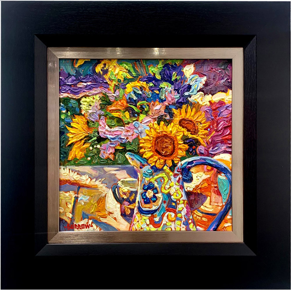 Massachusetts native, John Burrow’s acrylic and oil paintings are always bright, full of color and imbued with a sense of joy and playfulness. When people see his paintings for the first time, they frequently comment about how good his work makes them feel. He enjoys being able to express his warm memories of growing up in a small New England town using a folk art style. But when he wants to capture the beauty of an old farmhouse surrounded by a luxuriant garden, he chooses to use a more impressionistic “impasto” technique.