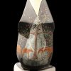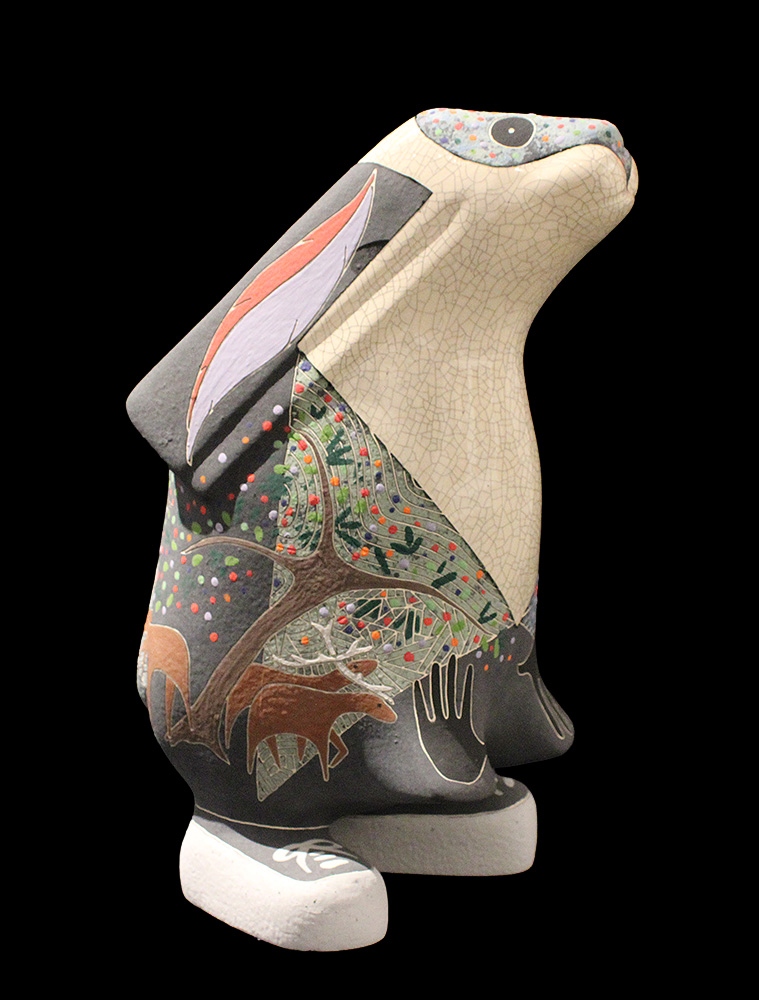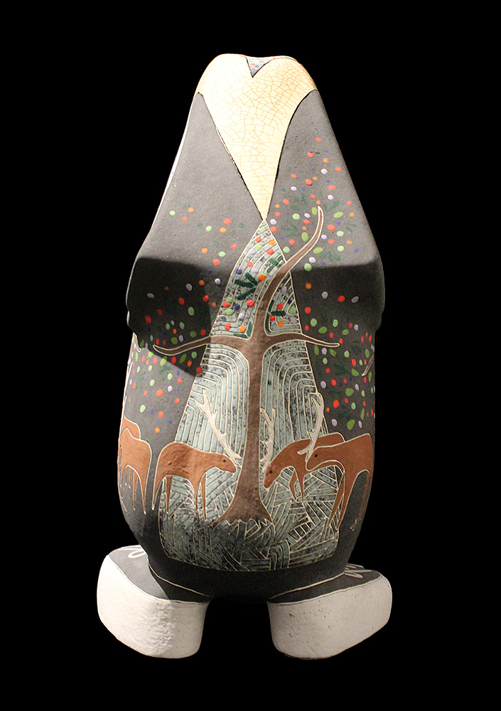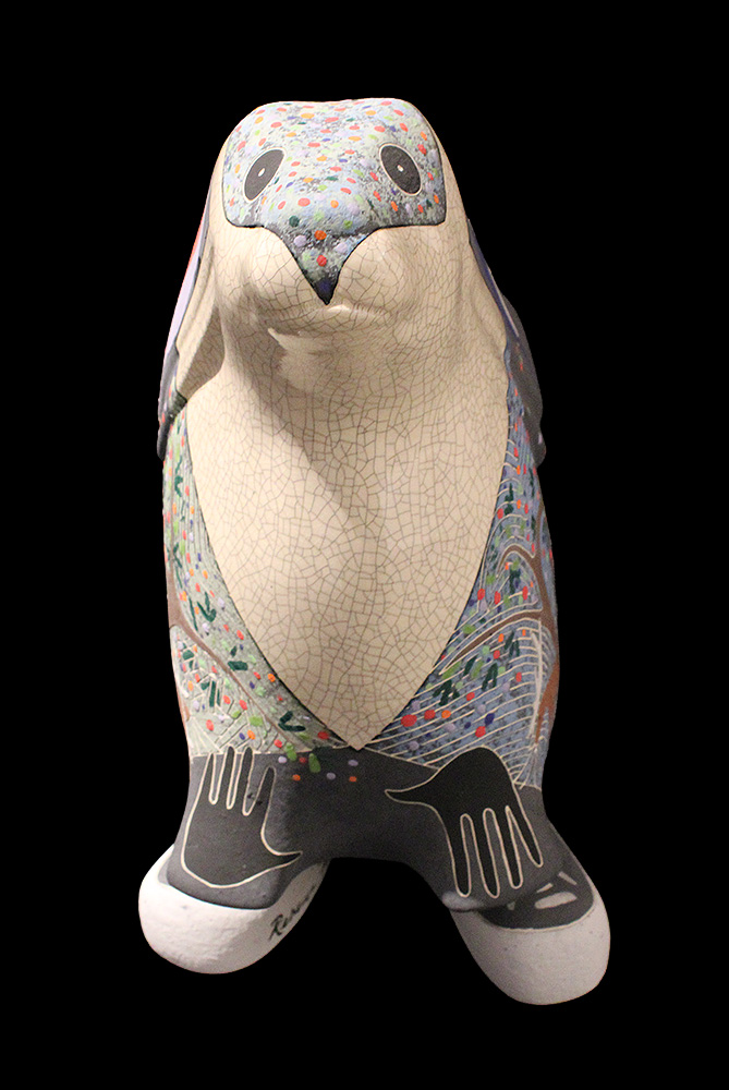 The collaboration began with Rebecca acting as assistant on Gene’s sculptures, which evolved from dishes and practical ceramics to stylized animals. “She was my glaze technician,” Tobey explained, meaning the person who applies the glazes before firing. The sculptures in the mid-1980’s were an interesting combination of techniques. Gene Tobey first made a mold of an animal and cut out sections to be superimposed on other parts of the animal. Then, using a steel stylus he engraved designs. Rebecca Tobey did the glazing, imbuing the sculptures with color before the final firing. Over the months, however, Rebecca Tobey slowly began to develop her own techniques and her own ideas about the kind of surfaces that would enhance the three-dimensional qualities of the sculptures.