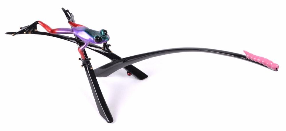 Clinging to a high-polish bronze reed, a vivid frog eagerly observes a bright pink caterpillar. With an edition of only 25, Heyday will not hang around for very long! Tim Cotterill, aka “Frogman”, was born in England and left school at an early age to complete an engineering apprenticeship and this metal-directed education provided a sound base for Tim’s future career in the arts. He started sculpting parts of radical wheeled vehicles, and finally found his calling in the design of animals and birds in the 70’s and 80’s. Over 1000 original steel, bronze, and gold sculptures by Frogman have been sold worldwide; many though Sotheby’s auction house in London. He immigrated to California in 1990 and has sold his art all across America. He has now fully focused on his Frogs. He developed a love for the frog’s unique, bulgy-eyed beauty. His bronzes capture the whimsical character; the jewel-like quality, and the pure job of these little creatures. He incorporates the expression, contour and subtly of these amphibians into his work, and no two will ever look exactly the same. Variations in coloring should be expected and appreciated.