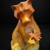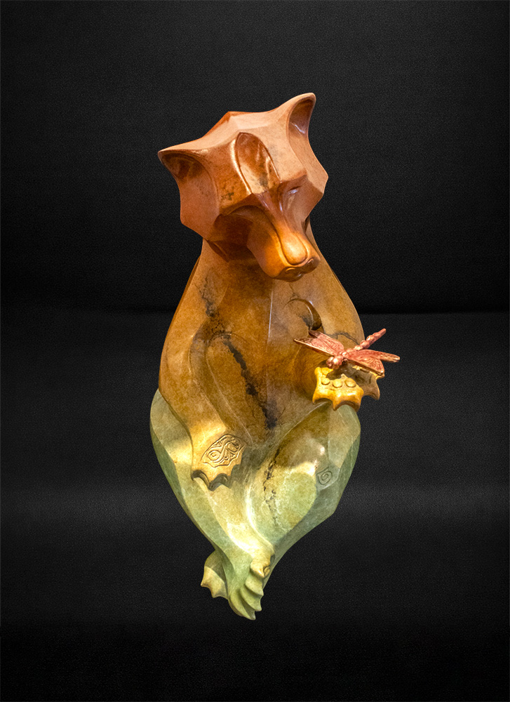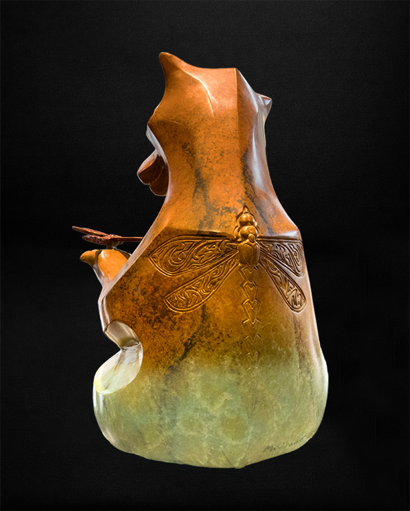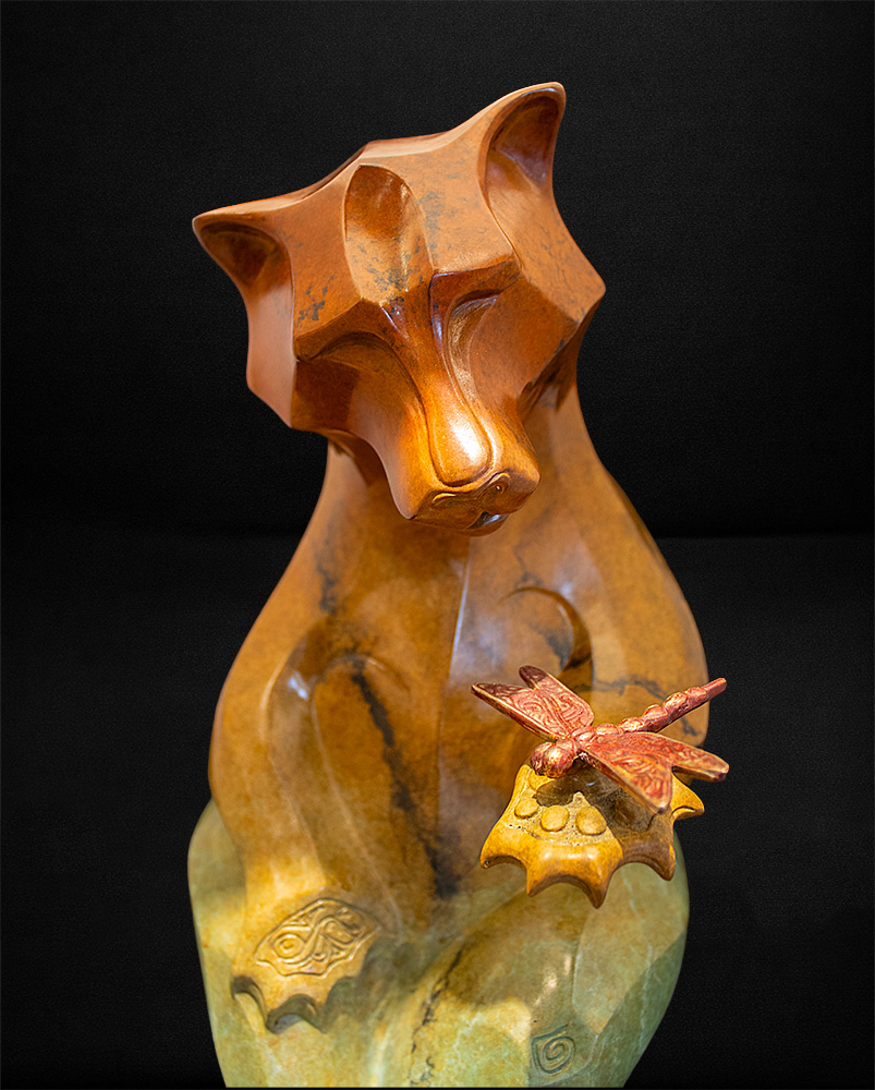 Many of my pieces have deep personal meanings so I try to include those stories and incorporate them into the sculpture as I create them. In many cultures the dragonfly symbolizes change and transformation. The native Americans knew if they saw a dragonfly in the desert, water was nearby, symbolizing hope. For me it definitely symbolizes hope. When our beautiful girl cat Cricket was attacked and near death, she had a slow recovery and eventually could sit outdoors. A small green dragonfly would visit every time. Like a sign from heaven giving her and us hope. Upon her death many years later, I have seen a dragonfly on her grave many times. The bear holds the dragonfly, both trusting one another, and the designs begin to move up the arm of the bear and eventual emerge on the bears back in the complete form of the dragonfly. Embracing and becoming part of the dragonfly. The bear receives the message of hope and transformation.