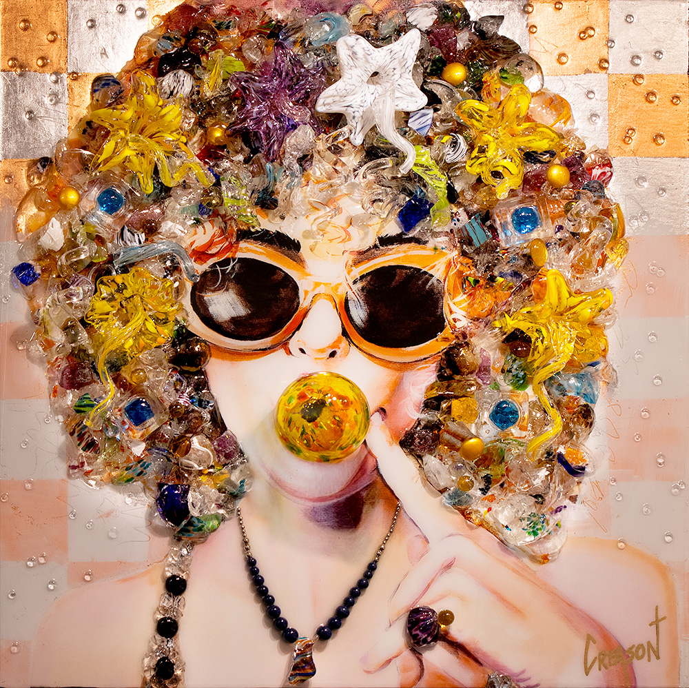 Creason’s works will invoke passion, boundless love, color and awe. His wife is his muse and main inspiration, always motivating him to create artwork that he might not have on his own. Creason chooses to depict women to spotlight their inner and outer strengths, beauty, and mystery. Using found jewelry, hand-blown glass, and garments to embellish his paintings, no two will ever be the same, but will always leave you inspired and entranced by his use of color.