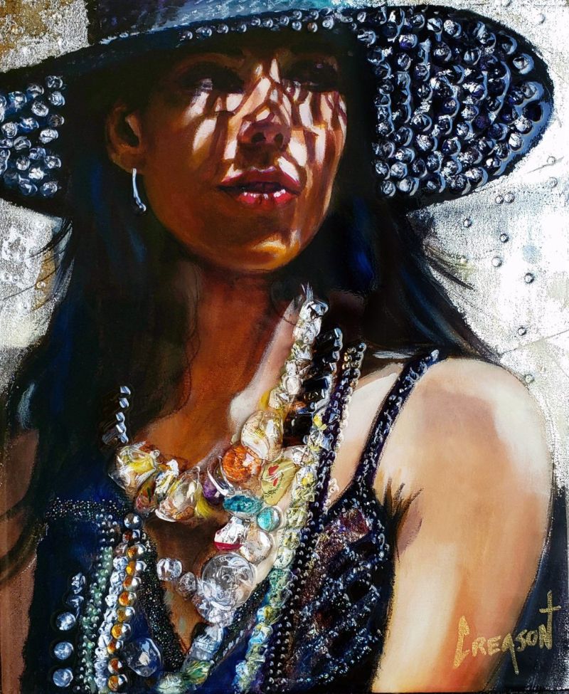 Creason’s works will invoke passion, boundless love, color and awe. His wife is his muse and main inspiration, always motivating him to create artwork that he might not have on his own. Creason chooses to depict women to spotlight their inner and outer strengths, beauty, and mystery. Using found jewelry, hand-blown glass, and garments to embellish his paintings, no two will ever be the same, but will always leave you inspired and entranced by his use of color.