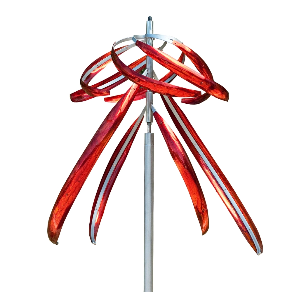 This kinetic wind sculpture is available in the colors Purple, Red, Stainless Steel, Teal, Copper, Cobalt or Green Verdigris.