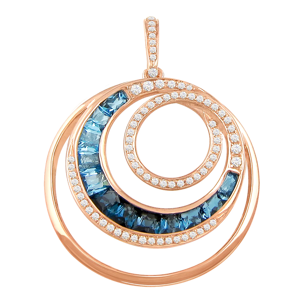 From the ‘MALIBU WAVE COLLECTION’ the enhancer is set in 14kt Rose Gold and contains approximately 0.48ct of genuine Diamonds and 4.50ct combination of genuine Swiss Blue Topaz and London Blue Topaz gemstones. Approximately 38mm in total height x 28mm at widest point.