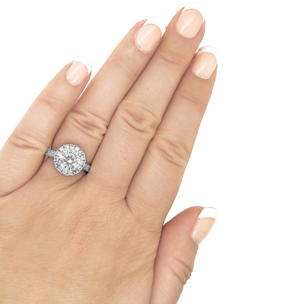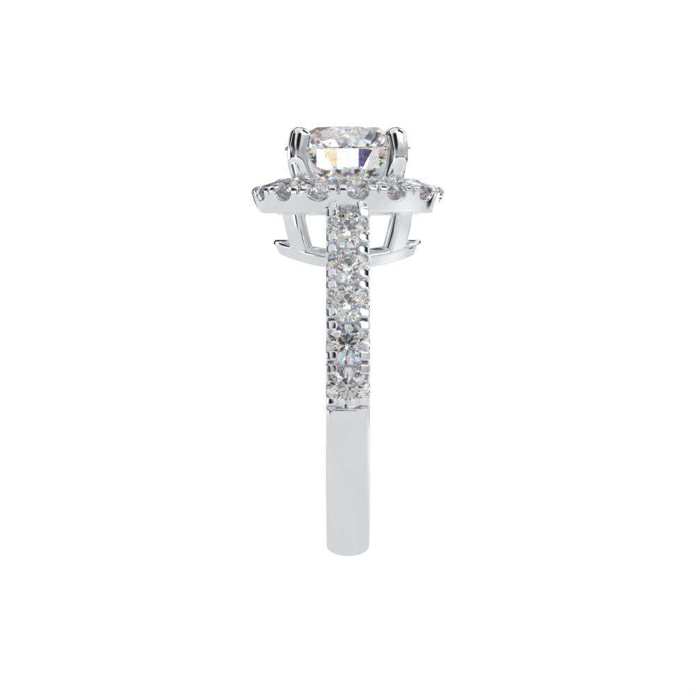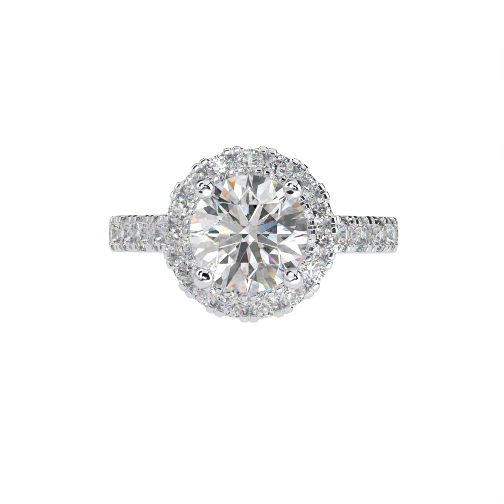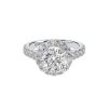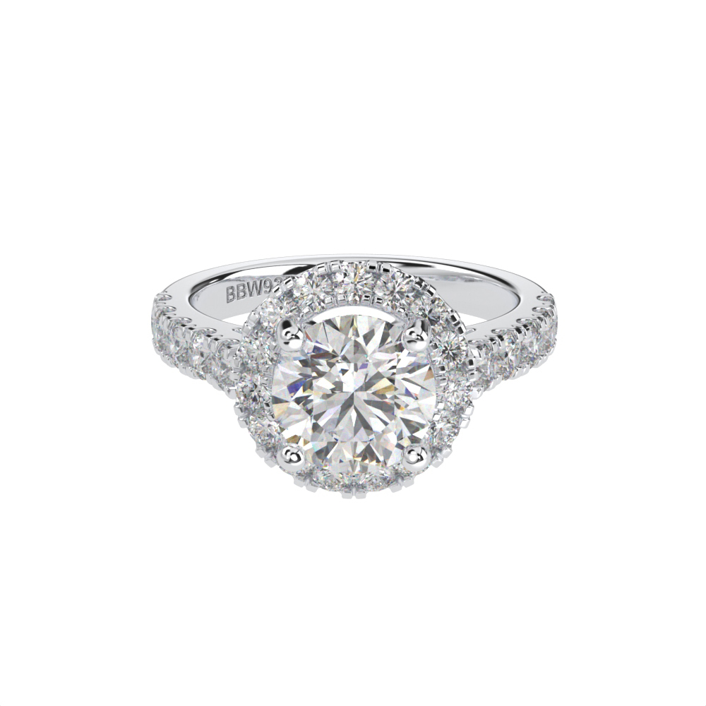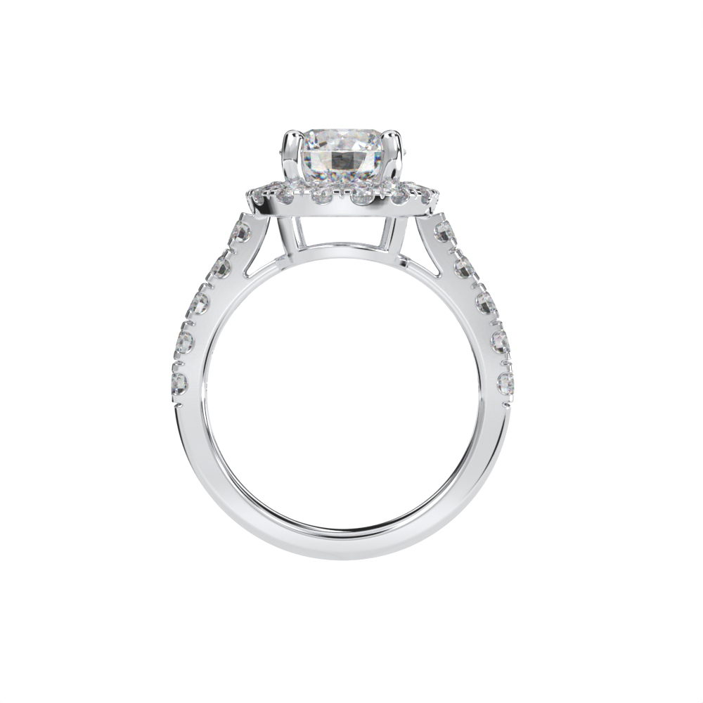 From the Couture Collection, this remarkable masterpiece is exquisitely engineered for both durability and prismatic light reflection. The brilliance of the center stone is perfectly complemented by a luminous halo. Each halo stone setting is cradled with four prongs per stone, and each stone is set deep into the setting for maximum protection of the stones. The setting design ensures the utmost security, as opposed to a shared prong, with one prong holding two stones, which is diamond industry standard. At Bling by Wilkening, we take design engineering further than the diamond industry standard to ensure settings are engineered for perfect light refractivity and unparalleled durability.