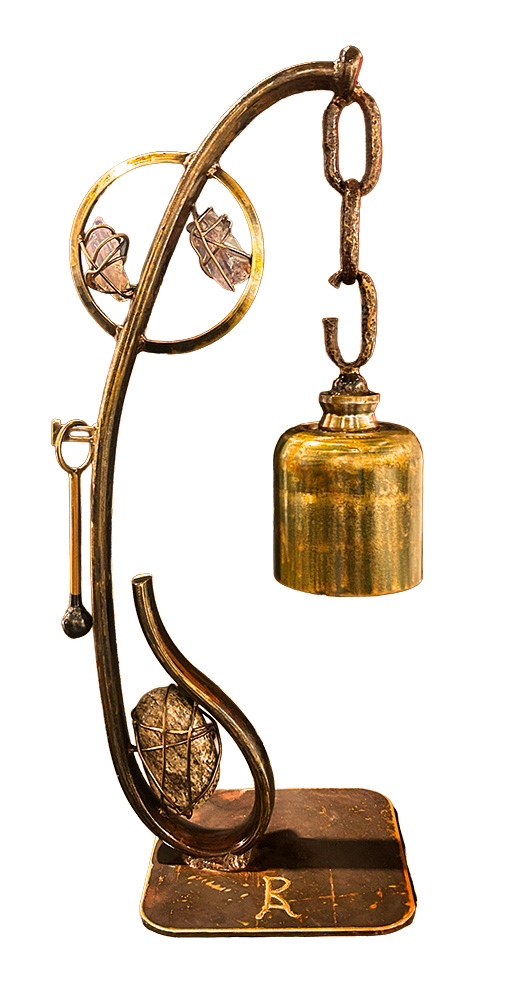 Ryan’s mother, Dianne Adams, has been a self-employed painter and fused glass artist for over 25 years. She creates incredibly captivating watercolor and ink paintings with unique incorporations of fused glass. With the help of his mother, Ryan integrates boldly colored fused glass throughout many of his bell sculptures.With his recycled metal sculptures, Ryan can turn everyday objects and tools into something meant to be savored and enjoyed. Through his signature bells, Ryan finds new and exciting ways to transform an antique wrench or rusty ax into a whole new experience both tonally and aesthetically. With the encouragement of his talented parents, Ryan’s future as an artist is sure to resonate with his collectors!