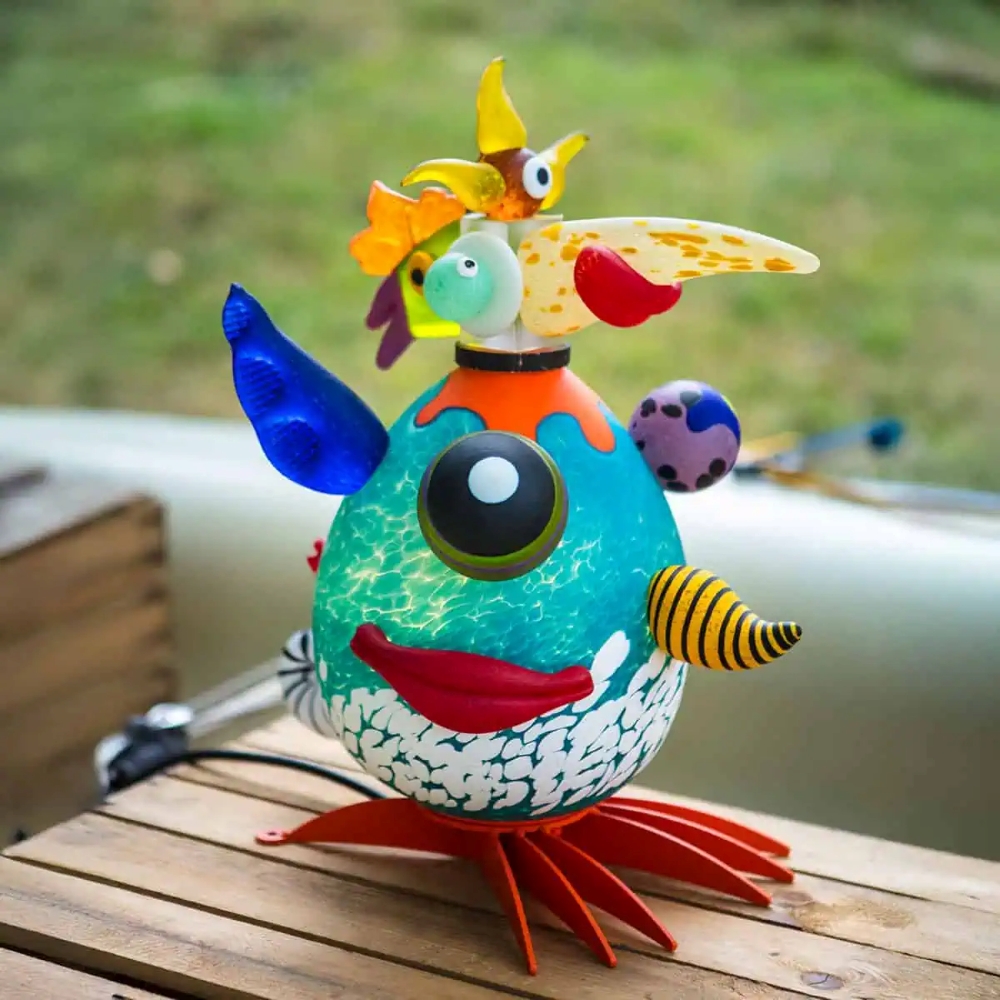 Humorous details like the small figures and horns that give the object wit and individuality.
