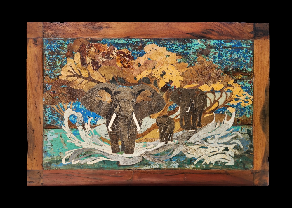 A beautiful autumn day in Africa is brought to life in this colorful scene of an elephant family splashing into a refreshing waterhole. The solid Teak wood coffee table features cut & fit stone inlaid into three painted time-weathered Bali Island fishing boat boards. This creates the mottled, multicolored sky and blue-green water element. The elephants are made of intricately scored pieces of gray-green quartzite with white quartz tusks. The bold colored trees are a blend of golden, orange, and bronze quartzites and yellow-gold travertine. The splashing, flowing water elements are a mix of blue-gray marble with green-white and gray quartz. The entire table, both stone and wood, is sealed, providing protection against and food or drink spills while ensuring that the colors will not fade.