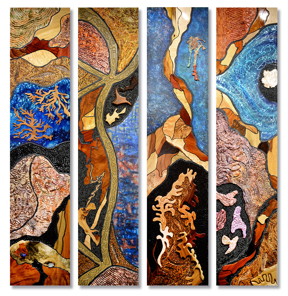 Together Connie Frasca and Karen Halliday carve and shape exotic woods such as buckeye, lace wood, redwood, and maple, working to maintain and accentuate the natural beauty of the materials. They have traveled the country in search of unusual pieces to sculpt, aiming in all of their sculptures to blend man (or woman) and nature. No two pieces will ever be the same because every element is hand-carved. Nothing is turned or sent through a machine. Though they have the technical skills necessary to create intricate, streamlined furniture and sculpture, they prefer their work to be more personal, free-flowing, and fresh. As their varied careers may suggest, both Frasca and Halliday are always driven to find new artistic challenges, and so their artwork has taken many forms over the years. The two begin by agreeing on a new, unique concept to pursue. Then they explore it fully, varying around one theme, until they feel it is time to move forward yet again. Their work ranges from wall panels to vessels, from carved and textured wooden inlay to smooth and harmonious layers of dye and glaze. Natural artistic talent backed by practical engineering experience allows Frasca and Halliday to create their imaginative work using many different mediums. With stone, wood, sand, and even fossil, Frasca and Halliday create art that is organic in feeling and timeless in style.Together Connie Frasca and Karen Halliday carve and shape exotic woods such as buckeye, lace wood, redwood, and maple, working to maintain and accentuate the natural beauty of the materials. They have traveled the country in search of unusual pieces to sculpt, aiming in all of their sculptures to blend man (or woman) and nature. No two pieces will ever be the same because every element is hand-carved. Nothing is turned or sent through a machine. Though they have the technical skills necessary to create intricate, streamlined furniture and sculpture, they prefer their work to be more personal, free-flowing, and fresh. As their varied careers may suggest, both Frasca and Halliday are always driven to find new artistic challenges, and so their artwork has taken many forms over the years. The two begin by agreeing on a new, unique concept to pursue. Then they explore it fully, varying around one theme, until they feel it is time to move forward yet again. Their work ranges from wall panels to vessels, from carved and textured wooden inlay to smooth and harmonious layers of dye and glaze. Natural artistic talent backed by practical engineering experience allows Frasca and Halliday to create their imaginative work using many different mediums. With stone, wood, sand, and even fossil, Frasca and Halliday create art that is organic in feeling and timeless in style.