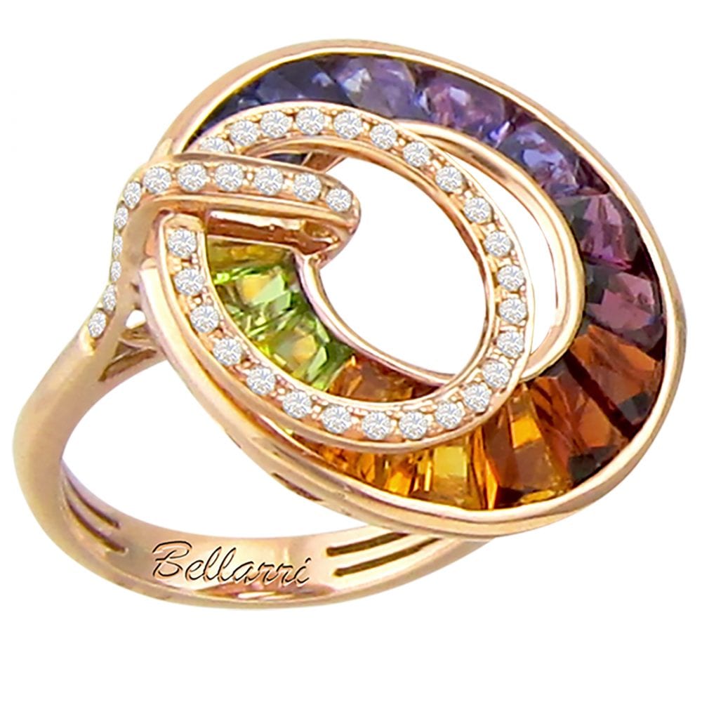 From the ‘POETRY IN MOTION COLLECTION’ the earrings are set in 14kt Rose Gold and contain approximately 0.36ct of genuine Diamonds and 4.65ct combination of genuine multi color gemstones (Amethyst, Blue Topaz, Citrine, Iolite, Peridot, and Rhodolite). Each piece of Bellarri jewelry in hand-crafted to an exclusive design with precious gems from around the world, and made in limited editions.