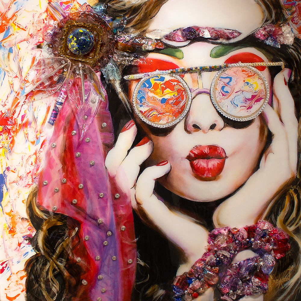 Creason’s works will invoke passion, boundless love, color and awe. His wife is his muse and main inspiration, always motivating him to create artwork that he might not have on his own. Creason chooses to depict women to spotlight their inner and outer strengths, beauty, and mystery. Using found jewelry, hand-blown glass, and garments to embellish his paintings, no two will ever be the same, but will always leave you inspired and entranced by his use of color.
