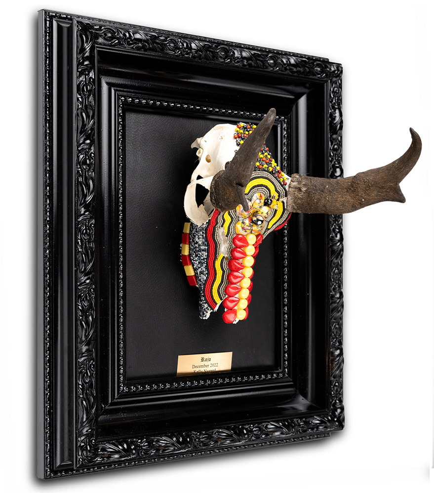 Pronghorn Skull from South Dakota plain. Includes vintage found jewelry objects, Czech Glass seed beads, set on a black leather background and antique frame. Skull can be removed from the frame to hang indepently on the wall