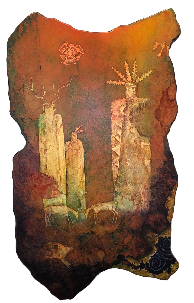 Cracks and crevices found in natural rock formations, were often locations for sacred petroglyph images. Ancient shamans reverently etched figures and symbols within and around these places of shadow , because they knew them to be doorways to the spirit world. This open doorway is the passage for a trio of ghostly figures. These robed figures seem to float across the rock surface, unbound by any earthly means, highly decorated and reverently etched into the rock, they represent returning spirits of shamans, which have passed from our world long ago.