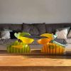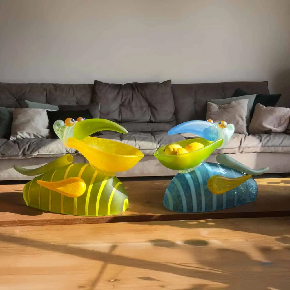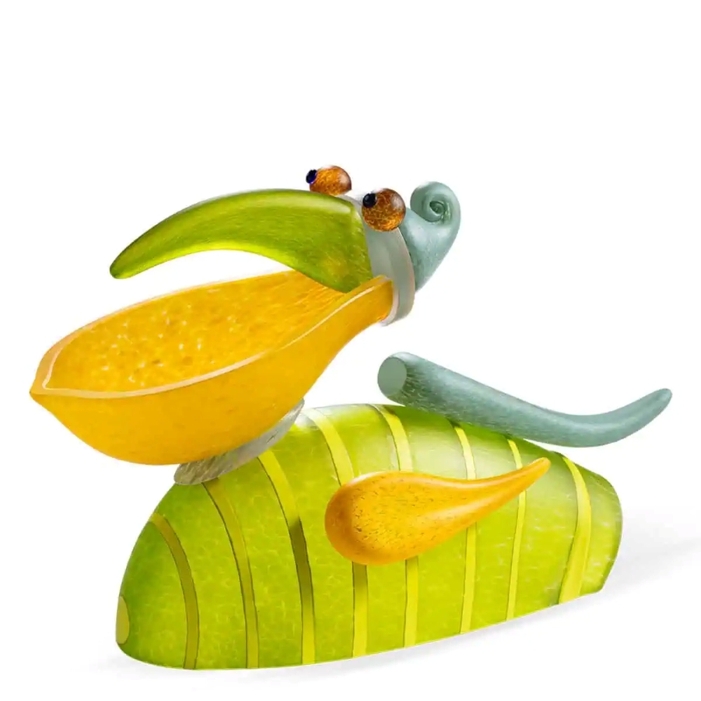 This hand-blown glass sculpture is available to order in the following colors: Blue, Yellow, & Lime Green. The pelican appears friendly, inviting, and self-assured – an object that immediately draws attention while remaining completely natural. With its beak wide open, it stands there as if in a grand gesture, as if it has just made the perfect catch – and one might think it’s about to add a comment.