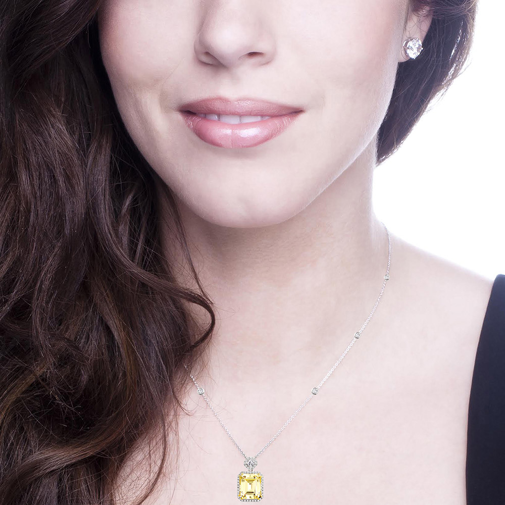 Exquisite emerald cut pendant is stunningly regal. Meticulously faceted center stone is approximately 8 carats. Modeled after the most exceptional fine jewelry, the fancy light yellow center stone features 18 karat gold plated prongs that highlight the beauty of the center stone. Clear and fancy light yellow stones are the finest grade cubic zirconia. Pendant is approximately .75 inches long, including hanging loop bale. Pendant is .5 inches wide. Chain measures 19 inches long, and may be worn at 18 and 17 inches because of the extension detailing. Please view additional image of necklace on model. Pendant and chain are sterling silver. Necklace will come packaged in a beautiful organza bag with enclosure card, inside of a silver gift box with satin lining and bow.