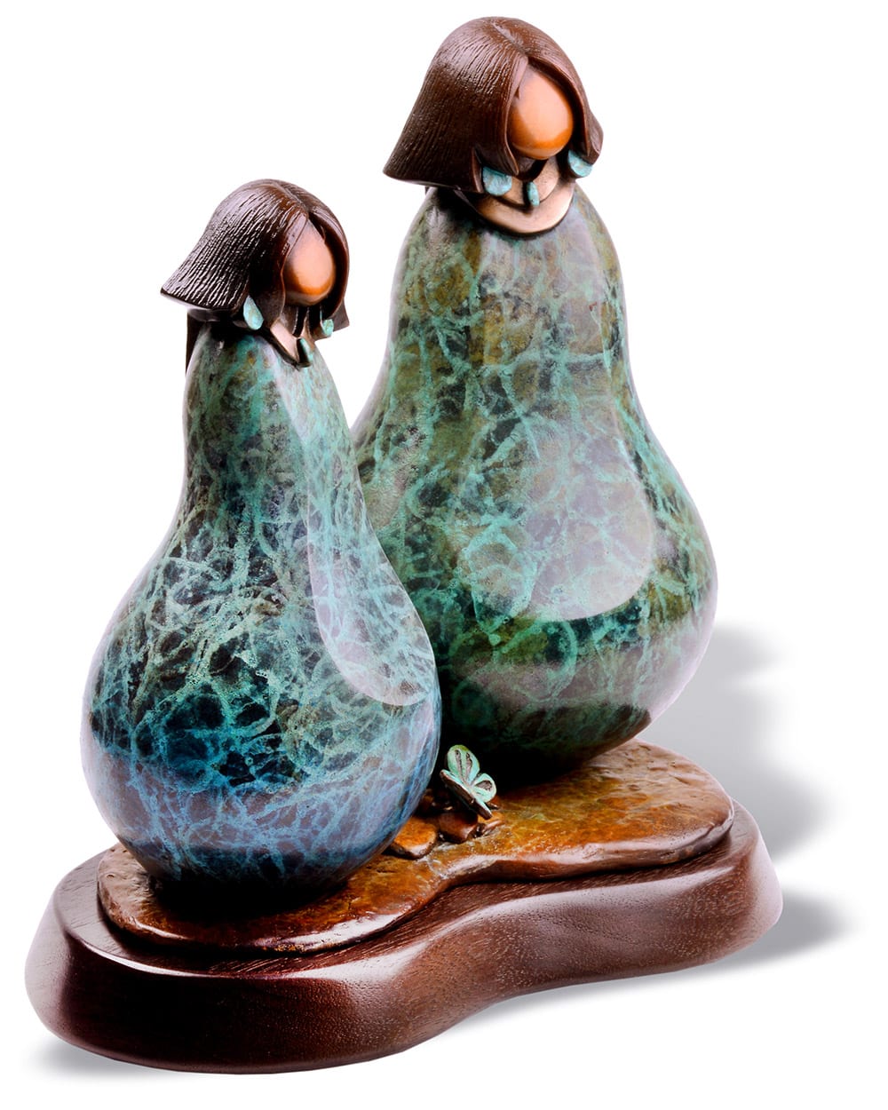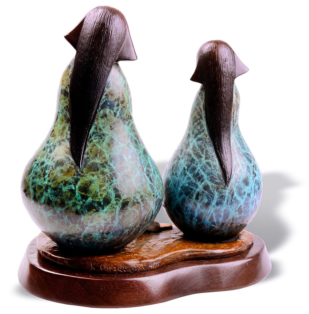 The flat plane that runs down the middle of there body represents the womb. In all aspects of Hopi the perpetuation of life is stressed. The Hopi people are a matriarchal society, where a child’s lineage comes from the mother. In traditional Hopi culture the women own the home, all of the household materials as well as the seeds planted every spring. A man will come to live with his wife’s family after marriage. Her hair is worn in a traditional style of being cut strait across her brow. This represents falling rain and reminds her of the prayers of all Hopi for rain. Her amulet represents clouds and lightening. The Patina represents a full cloud ready to burst with rain. This is the prayer of all Hopi people.