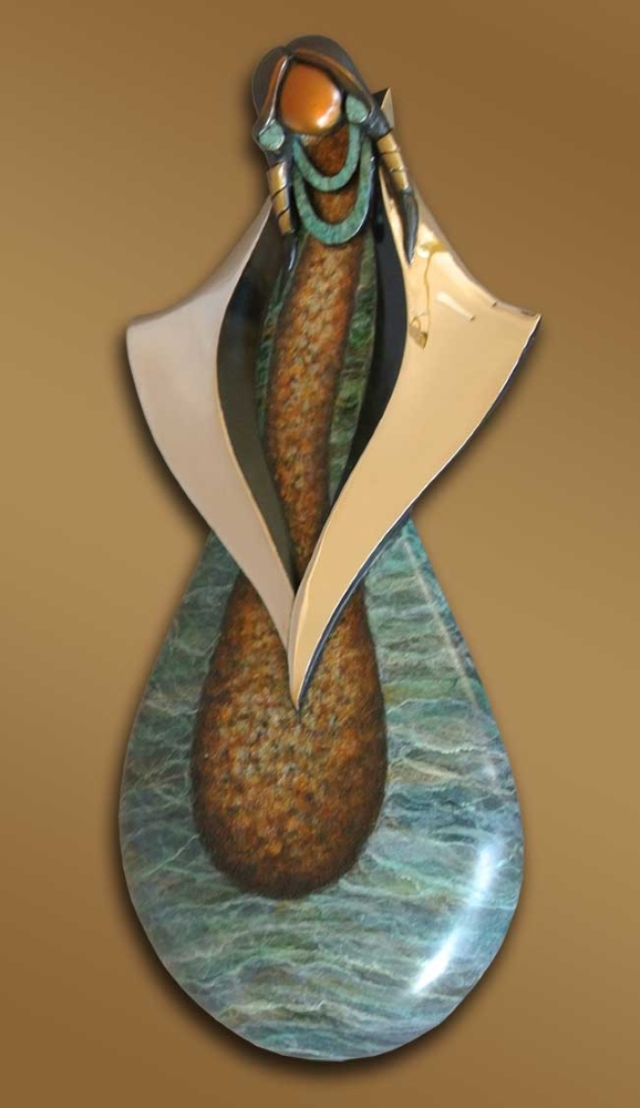 Her body is in the shape of a gourd, the oldest utilitarian vessel known to mankind. The gourd is used as storage, to carry water, to shape pottery and as a rattle in ceremonies.