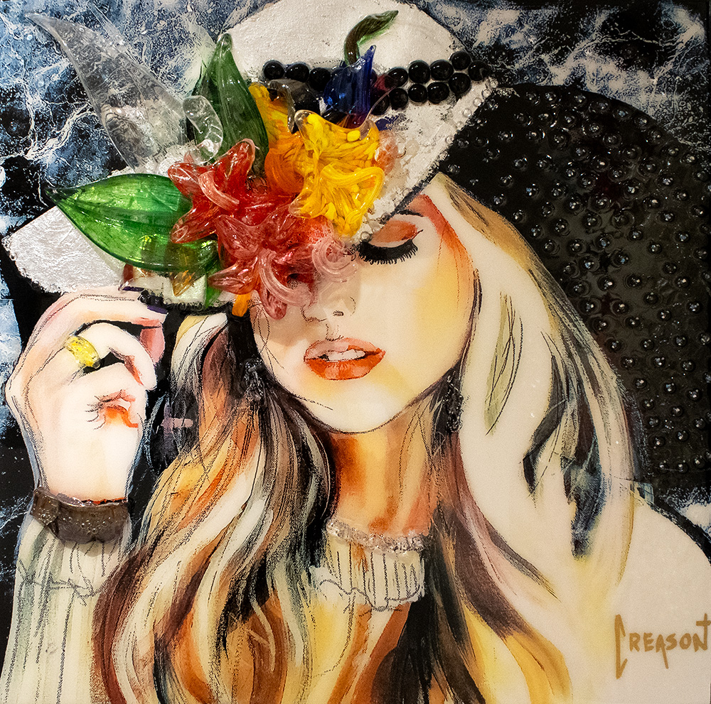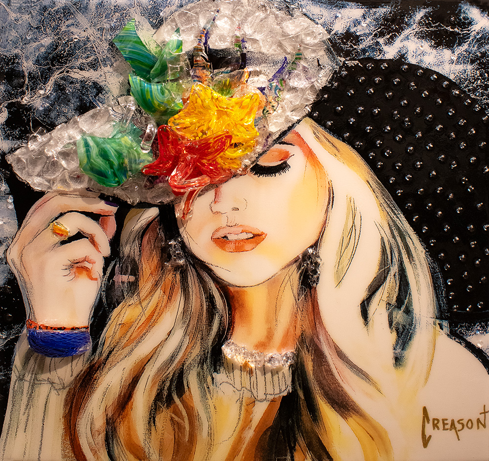 Creason’s works will invoke passion, boundless love, color and awe. His wife is his muse and main inspiration, always motivating him to create artwork that he might not have on his own. Creason chooses to depict women to spotlight their inner and outer strengths, beauty, and mystery. Using found jewelry, hand-blown glass, and garments to embellish his paintings, no two will ever be the same, but will always leave you inspired and entranced by his use of color.