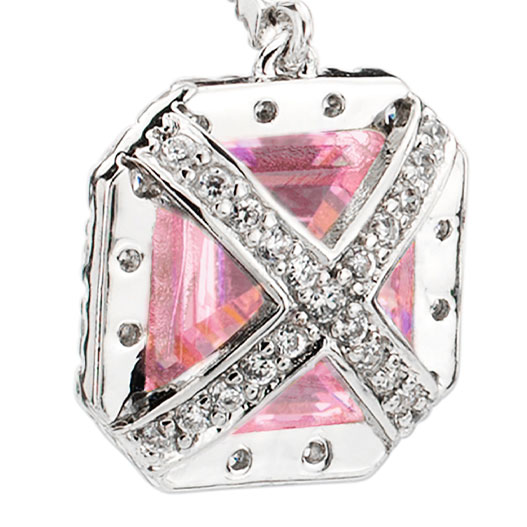 The magnificent asscher cut fancy light pink center stones are suspended in a brilliant border of clear cubic zirconia of the finest grade. This expert center stone cutting, designed by Bling by Wilkening, features angled corners and precision faceting on the asscher cut to ensure the captivating light pink hue prismatically dances in the light. This specific hue of fancy light pink is very rare in cubic zirconia, and mirrors the light refractivity of the most finely faceted light pink diamond.