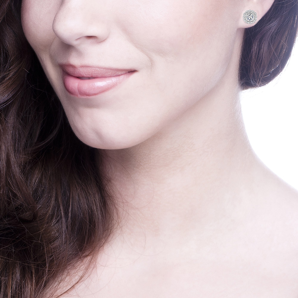 Exquisite vintage inspired earrings are timeless and elegant. Earrings are created with illustrious hand-selected and hand set cubic zirconia of the finest grade. Total carat weight of each center stone is approximately .75 carats. Earrings are 10mm across, including halo border. Earrings are pierced. Please view additional model image for size scale. Earrings feature a wider disc backing to ensure they stay upright on the ears and sit beautifully. Earrings match our Round Vintage Lace Necklace. Earrings will come packaged in a beautiful organza bag with enclosure card, inside of a silver gift box with satin lining and bow.