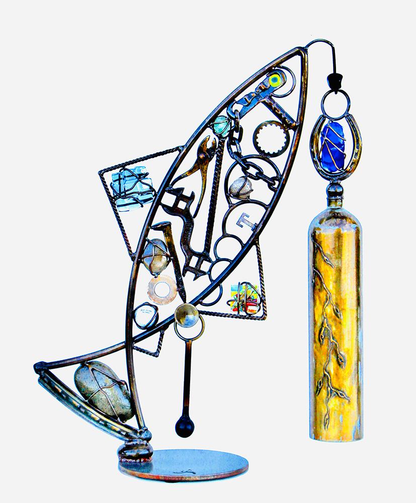 Doug Adams started working for a large steel mill. He quickly became entranced by the process of taking recycled metal from its simple form and making a new useable product. From the 65 ton electric arc furnaces spewing out molten steel, to the continuous caster cutting steel weighing 1.5 tons into 25’ lengths, to the final result of dozens of marketable steel shapes, Doug fell in love with steel. The work was hot, dirty and often times dangerous to perform. Fast forward 30 years, and Doug Adams’ experiences in the steel industry have come to inform all of his one-of-a-kind sculptural bells.