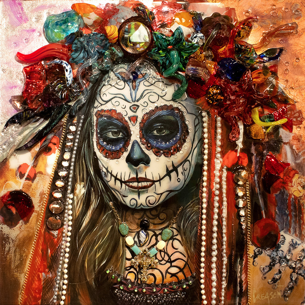 Creason’s works will invoke passion, boundless love, color and awe. His wife is his muse and main inspiration, always motivating him to create artwork that he might not have on his own. Creason chooses to depict women to spotlight their inner and outer strengths, beauty, and mystery. Using found jewelry, hand-blown glass, and garments to embellish his paintings, no two will ever be the same, but will always leave you inspired and entranced by his use of color.