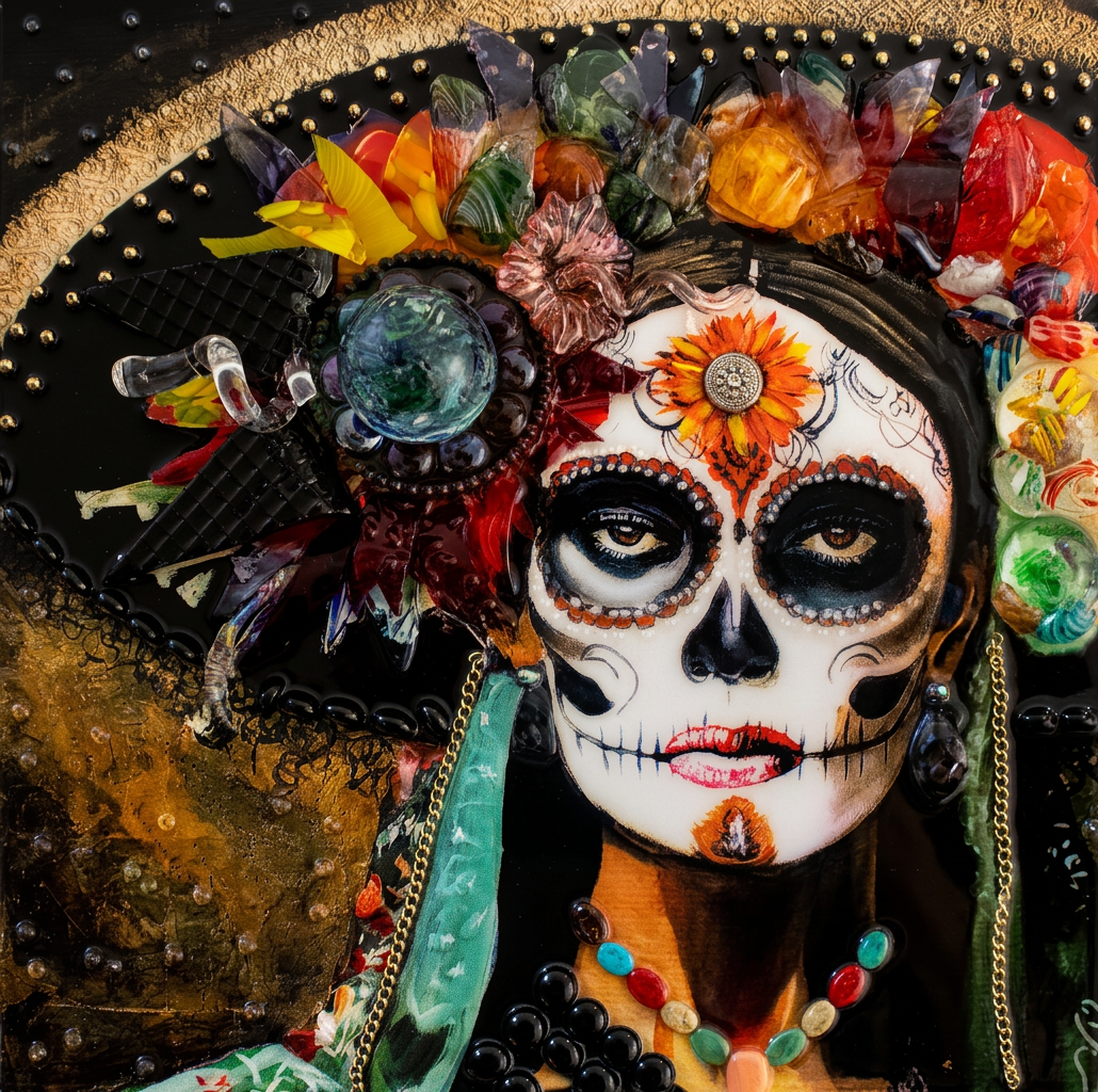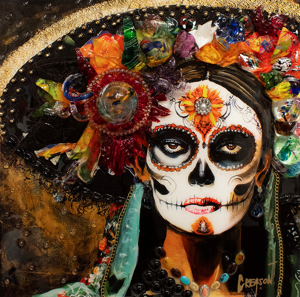 “Sugar Skull IV” is the latest in Creason’s Sugar Skull Series celebrating the Mexican Day of the Dead celebration. “Sugar Skull IV” features La Catrina, the costumed skeleton, which dominates in most Day of the Dead celebrations.