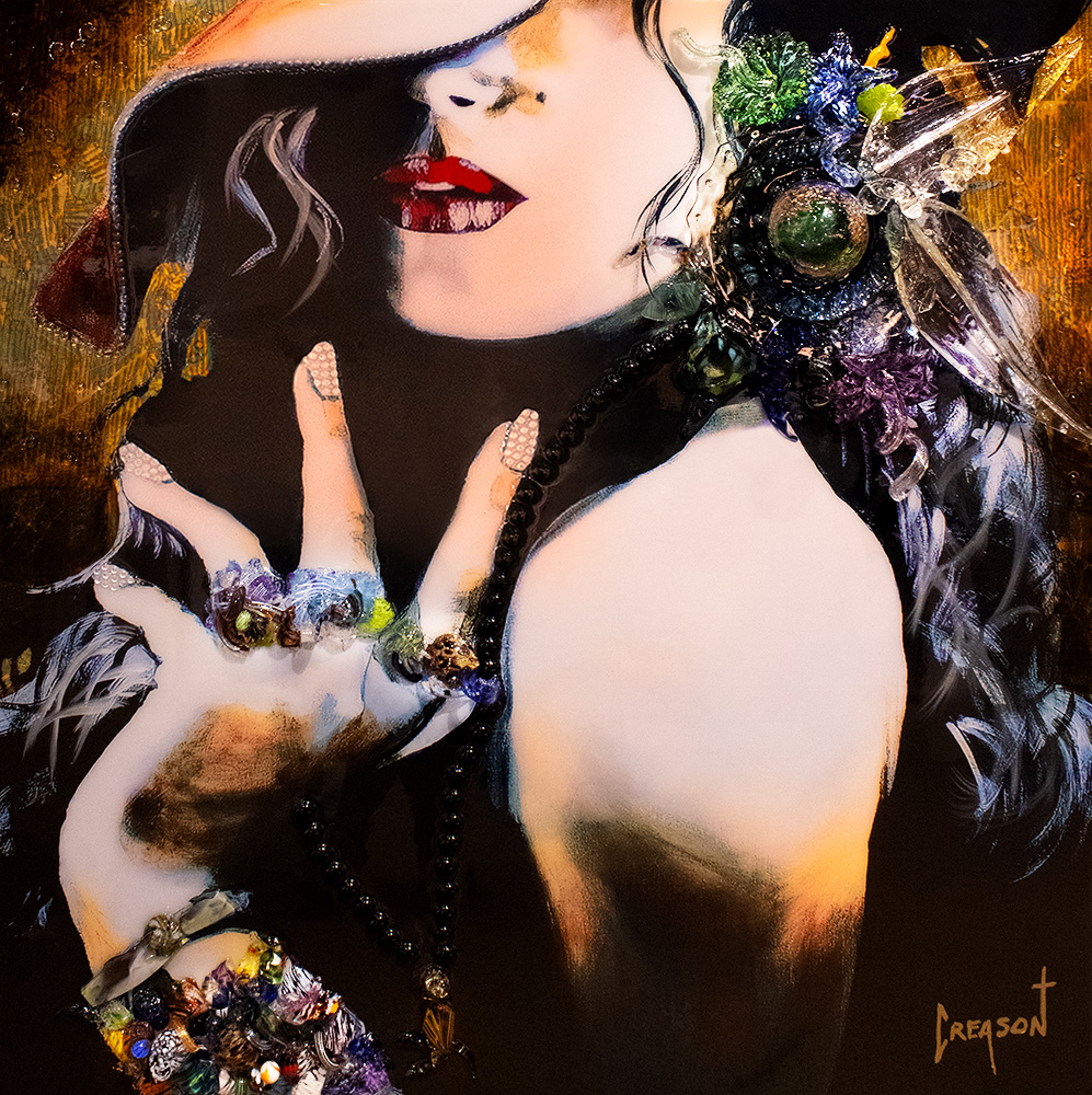 Creason’s works will invoke passion, boundless love, color and awe. His wife is his muse and main inspiration, always motivating him to create artwork that he might not have on his own. Creason chooses to depict women to spotlight their inner and outer strengths, beauty, and mystery. Using found jewelry, hand-blown glass, and garments to embellish his paintings, no two will ever be the same, but will always leave you inspired and entranced by his use of color.