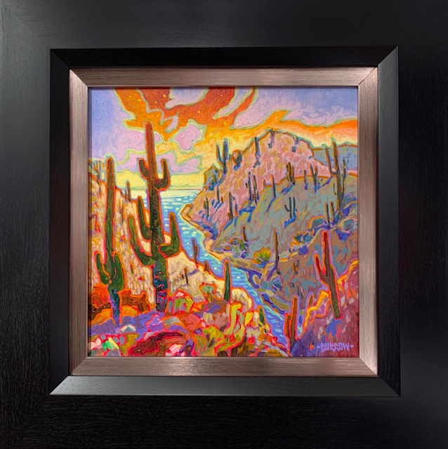 Massachusetts native, John Burrow’s acrylic and oil paintings are always bright, full of color and imbued with a sense of joy and playfulness. When people see his paintings for the first time, they frequently comment about how good his work makes them feel. He enjoys being able to express his warm memories of growing up in a small New England town using a folk art style. But when he wants to capture the beauty of an old farmhouse surrounded by a luxuriant garden, he chooses to use a more impressionistic “impasto” technique.