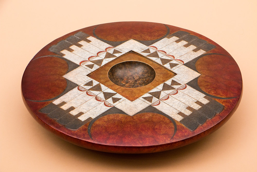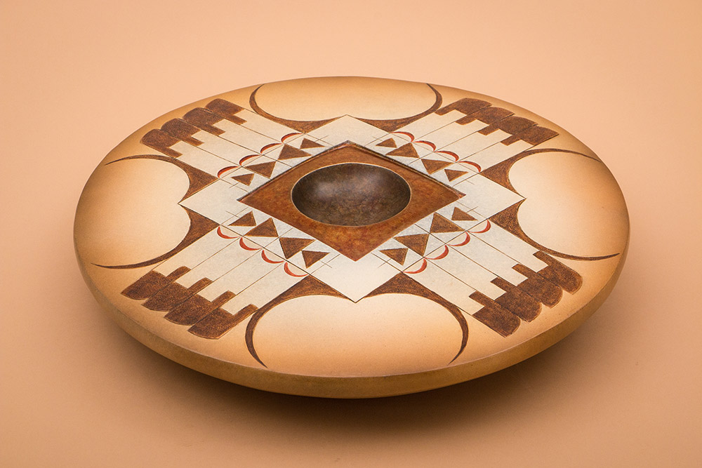 This eagle feather design surrounding a red square is an adapted example of a motif found at the Sikyatki ruins that has evolved into only the wing portion from a lateral view. Hopi pottery is made from a fine clay, enabling the potter to polish it with a smooth stone and apply mineral and vegetal paints directly onto the surface. This yellow ware is distinctly characteristic of today’s Hopi.